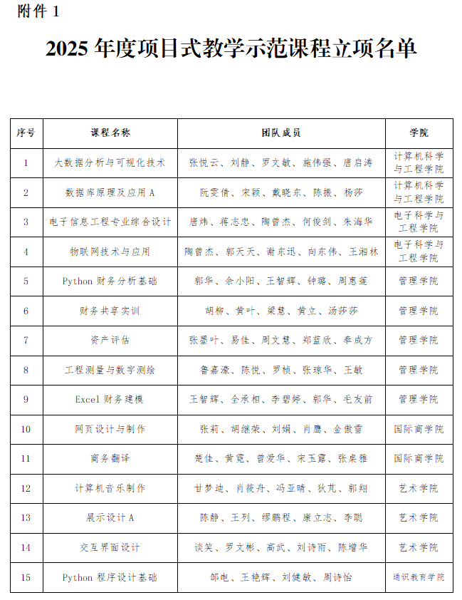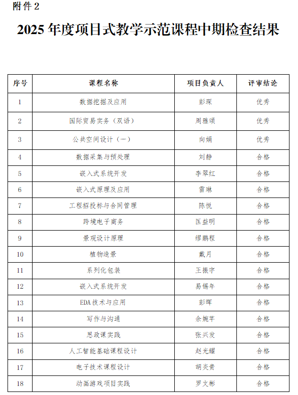 根据《关于开展2025年度项目式教学示范课程相关工作的通知》(湘信院教务处〔2025〕171号)精神,教务处组织开展了2025年度校级项目式教学示范课程立项评审、中期检查工作,现将结果公布如下: