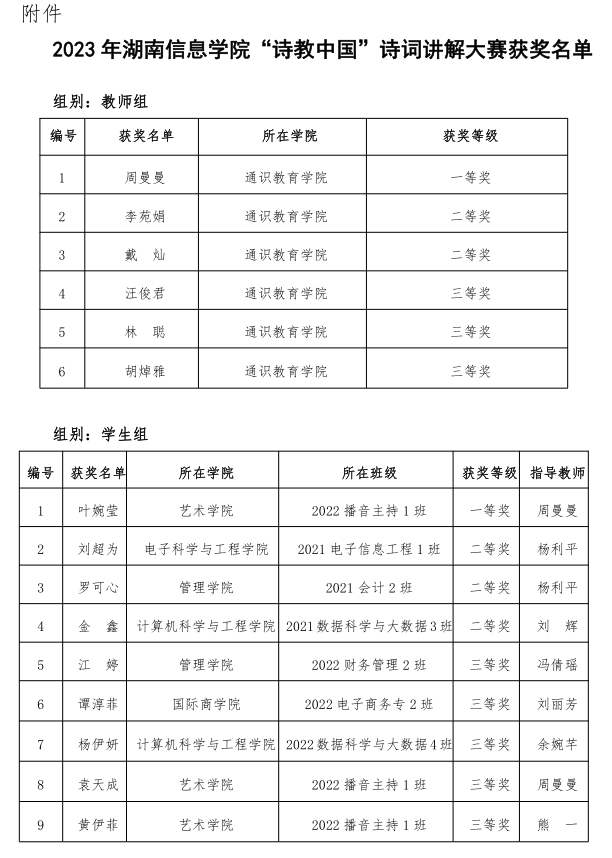 附件:2023 年湖南信息学院“诗教中国”诗词讲解大赛获奖名单