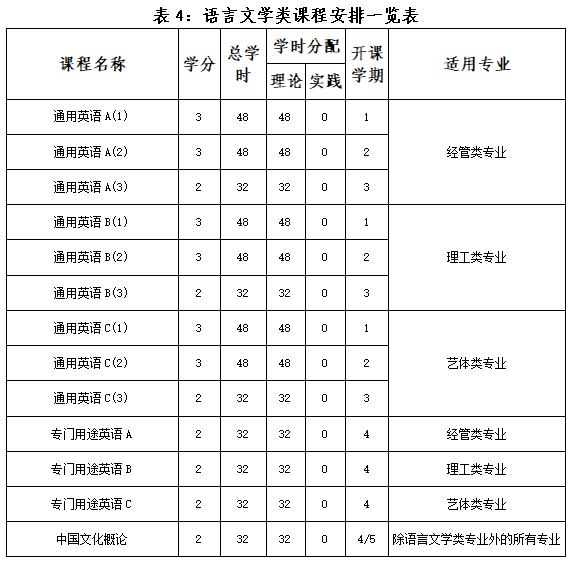 语言文学类包括《通用英语》《专门用途英语》和《中国文化概论》。《通用英语》分专业类别开设,学生修读《通用英语》(1)(2)(3)后,于第四学期修读“专门用途英语”;语言文学类专业开设第二外语。同时,开设《跨文化交际》等语言技能选修课,供各学院根据专业发展要求和学生多元需求选择修读,保证“外语四年不断线”。非语言文学类专业开设《中国文化概论》,语言文学类专业自行开设相关高阶课程。
