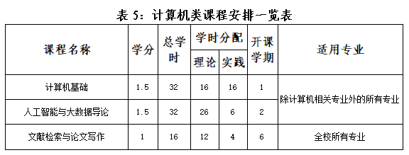 非计算机类专业开设《计算机基础》《人工智能与大数据导论》两门课程,各1.5学分;计算机相关专业自行开设高阶计算机课程。全校所有专业开设《文献检索与论文写作》课程。