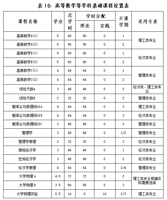 各二级学院要积极构建学科基础课程平台,打通各专业的基础课程,鼓励跨学院建设相近专业共用的基础课程。加强对已形成的数学类、经济管理类等跨学院大类专业基础课的建设。进一步优化学科基础课程模块设置,各专业根据培养要求进行选择,具体安排及要求如表10。原则上,各专业学科基础课程为8~16门。
