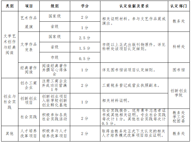 (一)素拓与双创学分分别由教务处、学工处、科研处、校团委、图书馆、教育学院等学校指定的认定部门进行认定。