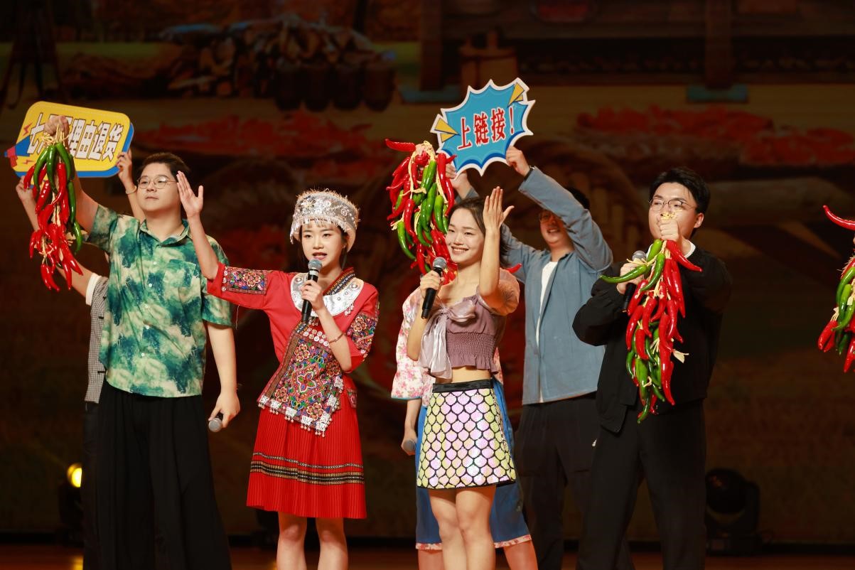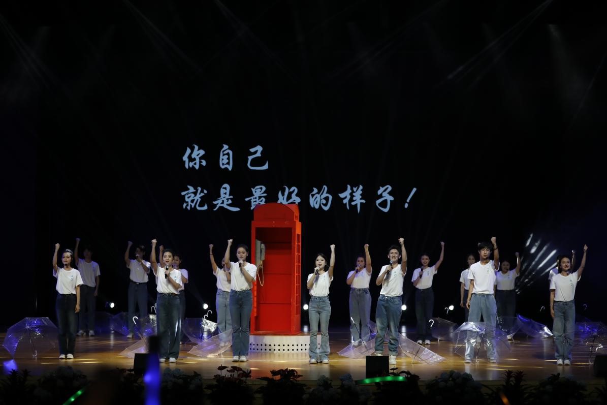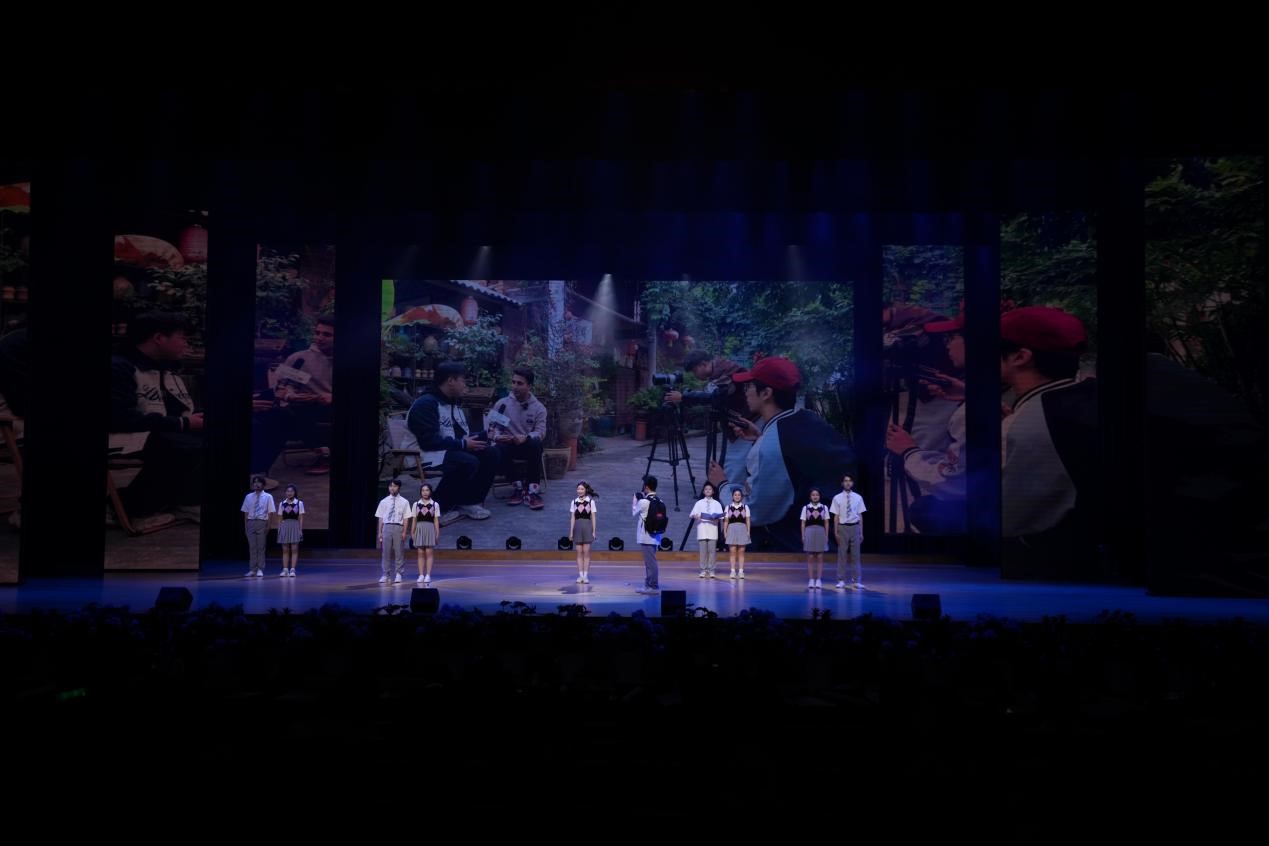 第一篇章中,新媒体主持节目《如此直播》基于短视频直播盛行、直播助农的大背景,展开了一幅传媒学子未来就业新画卷。随后的情景讲述节目《电话亭》,以自我拷问与呐喊,告诉青年学子如何学着接受困惑与不安,当人生电话响起时,去寻找心中的自己。音乐剧《传播大时代》展现了作为播主学子讲好中国故事,传播好中国声音的新生力量。配音节目《百花骨朵儿》,以颁奖典礼的形式,将极具特点的人物声线中不同角色特征逼真演绎,向全场观众展示了一场“声音盛宴”。
