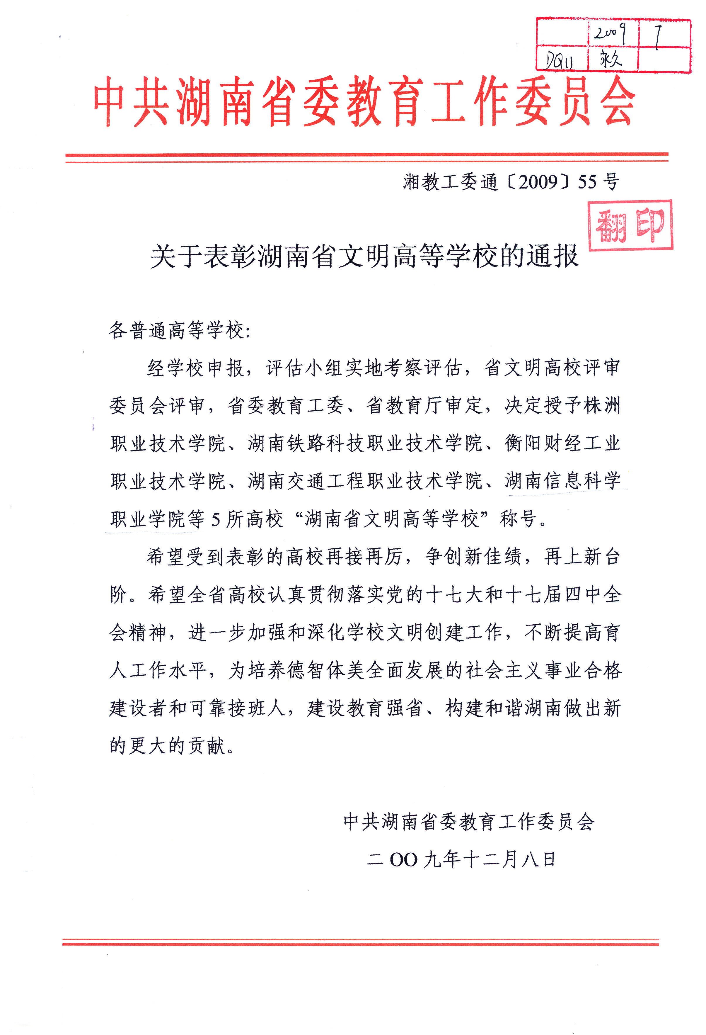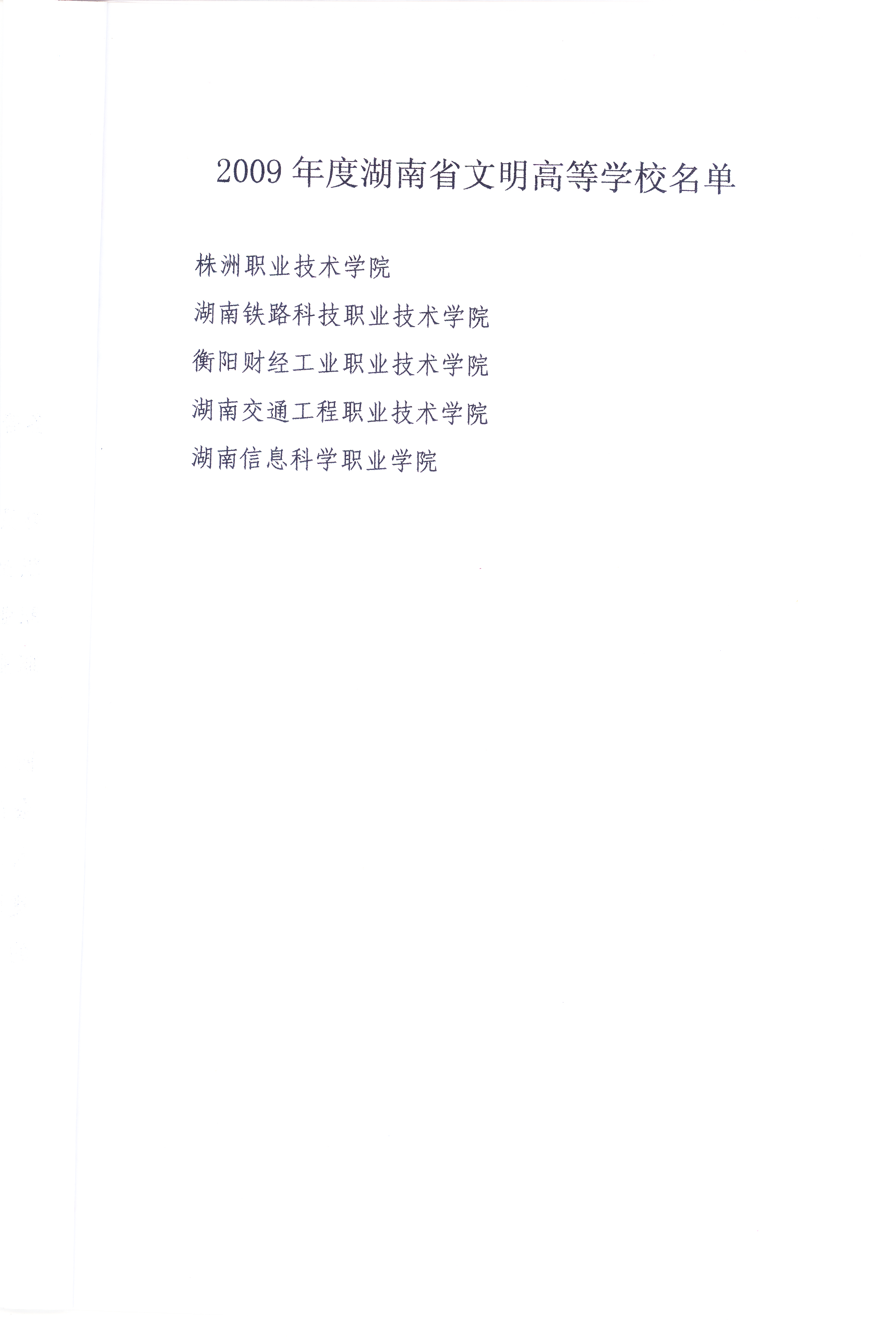 学校获评2009年湖南省文明高校