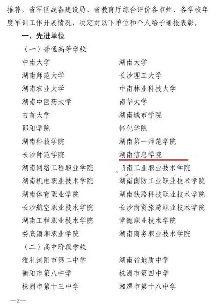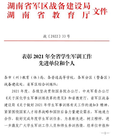 1月27日,湖南省军区战备建设局、省教育厅联合下发了《表彰2021年全省学生军训工作先进单位和个人》,我校获评“全省学生军训工作先进单位”