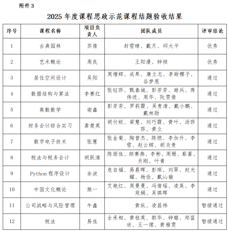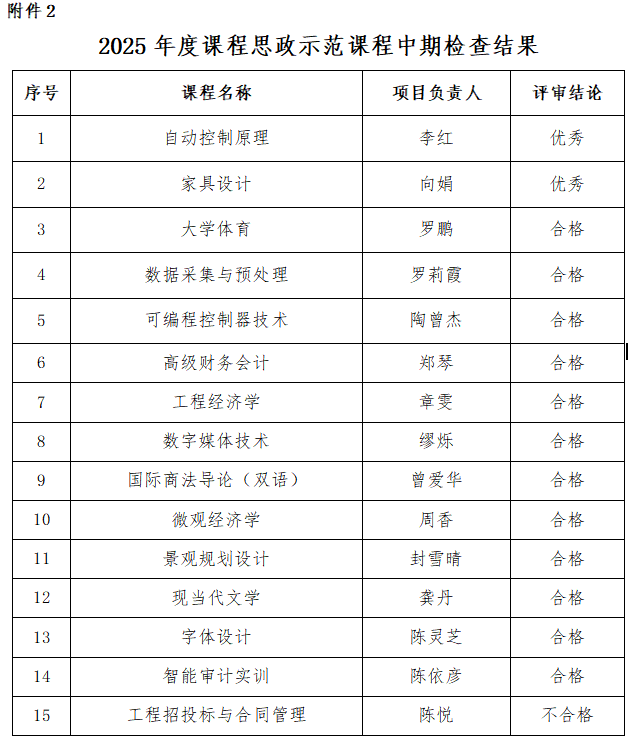 根据《关于开展2025年课程思政示范课程相关工作的通知》(湘信院教务处〔2025〕187号)精神,教务处组织开展了2025年度校级课程思政示范课程申报立项、中期检查和结题验收工作,现将结果公布如下: