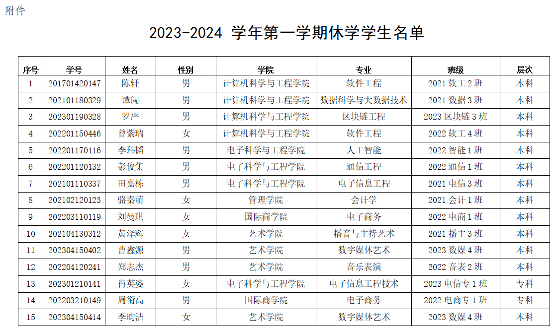 依据《湖南信息学院学生学籍管理规定》以及《湖南信息学院学生休(复)学管理办法》文件精神,经学生本人申请,学校审核,同意陈轩等15名学生休学,具体名单详见附件。